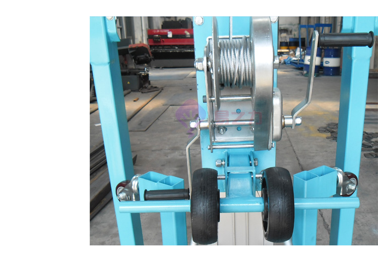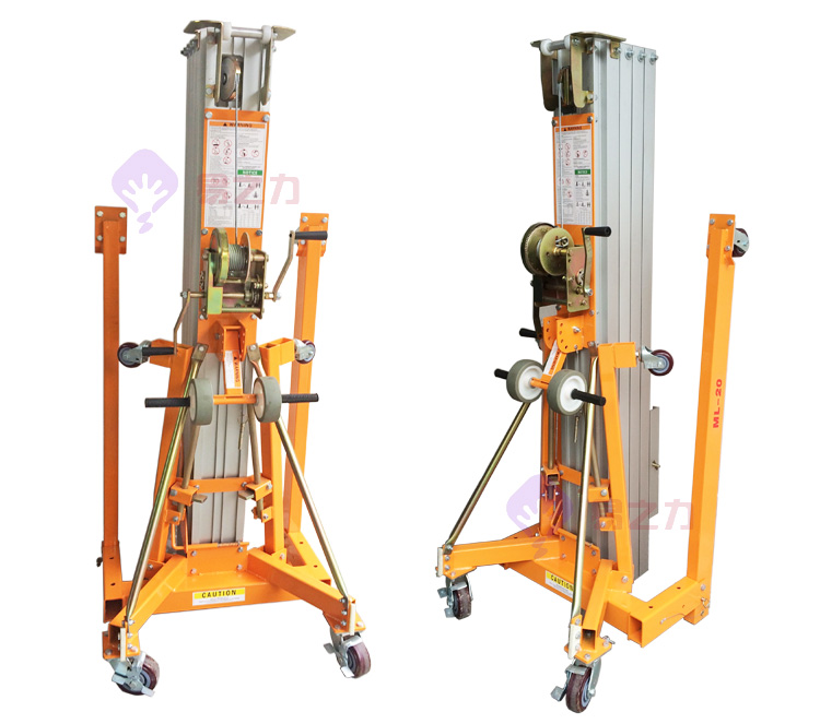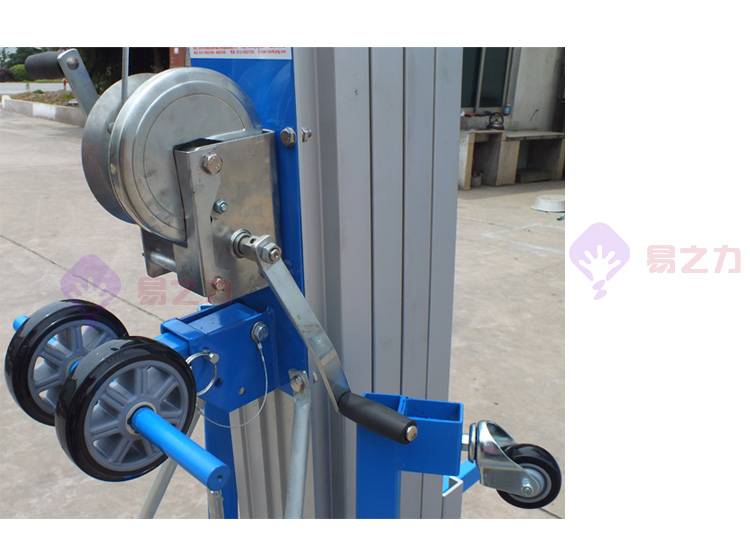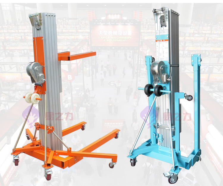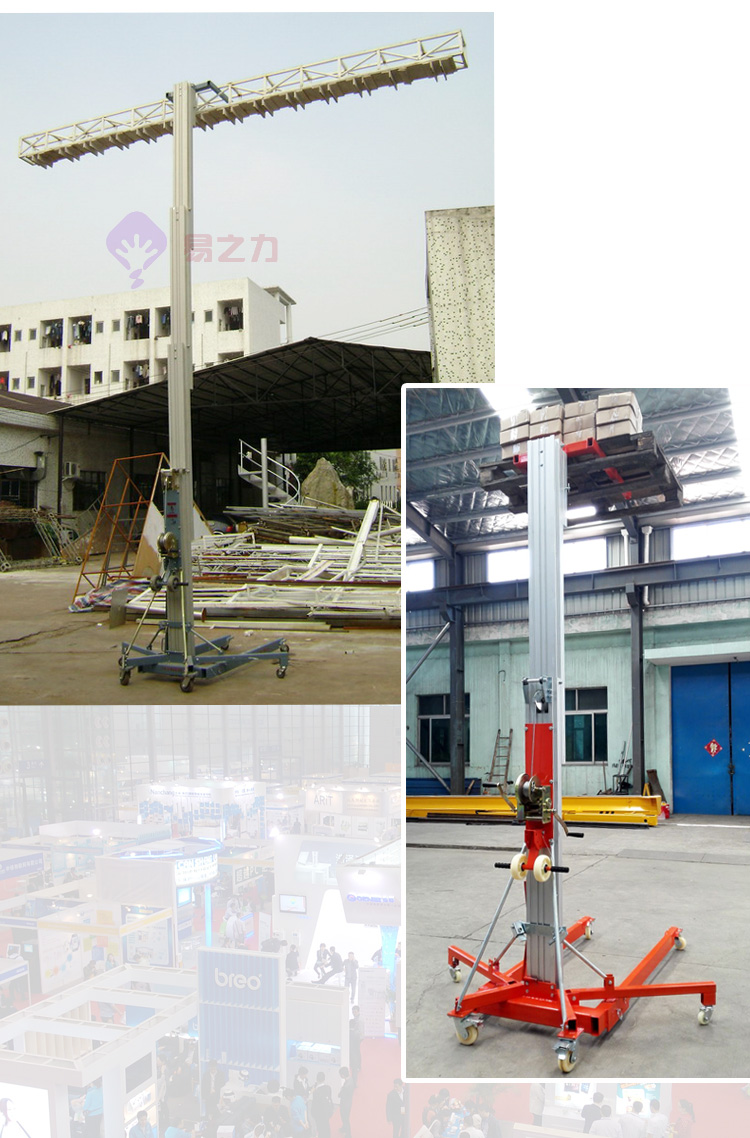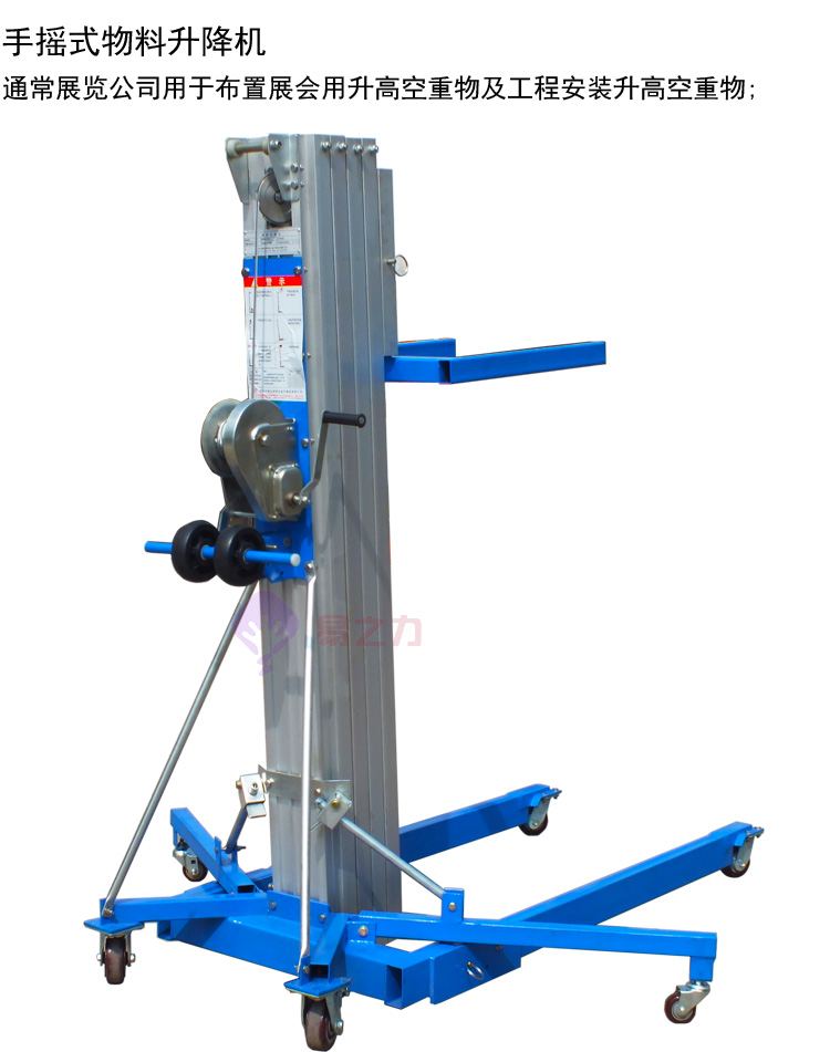 搖式物料升降機(jī),采用手搖桿帶動(dòng)鋼絲繩牽動(dòng)鋁合金桅桿上升的一種手搖式升降設(shè)備,主要在臨時(shí)搭建工程中起到輔助搭建的作用,一般在大型展會(huì)上和大型活動(dòng)中運(yùn)用較多。
